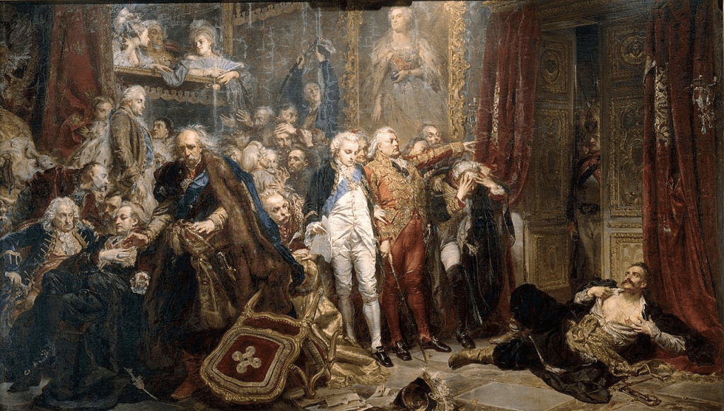 I recently started listening to A History of Eastern Europe by The Great Courses. In Lecture 4, Professor Vejas Gabriel Liulevicius, Ph.D. describes the first partition of Poland by the great powers of Europe. In 1773, Tadeusz Rejtan protested before the Polish parliament, which was set to approve of the partition. According to the story, Rejtan threw himself in the doorway, his chest bared, as the members of parliament attempted to leave the building. The moment was immortalized in Rejtan, or the Fall of Poland by Jan Matejko in 1866. Professor Liulevicius mentioned the painting in the lecture, so I thought I would check it out.